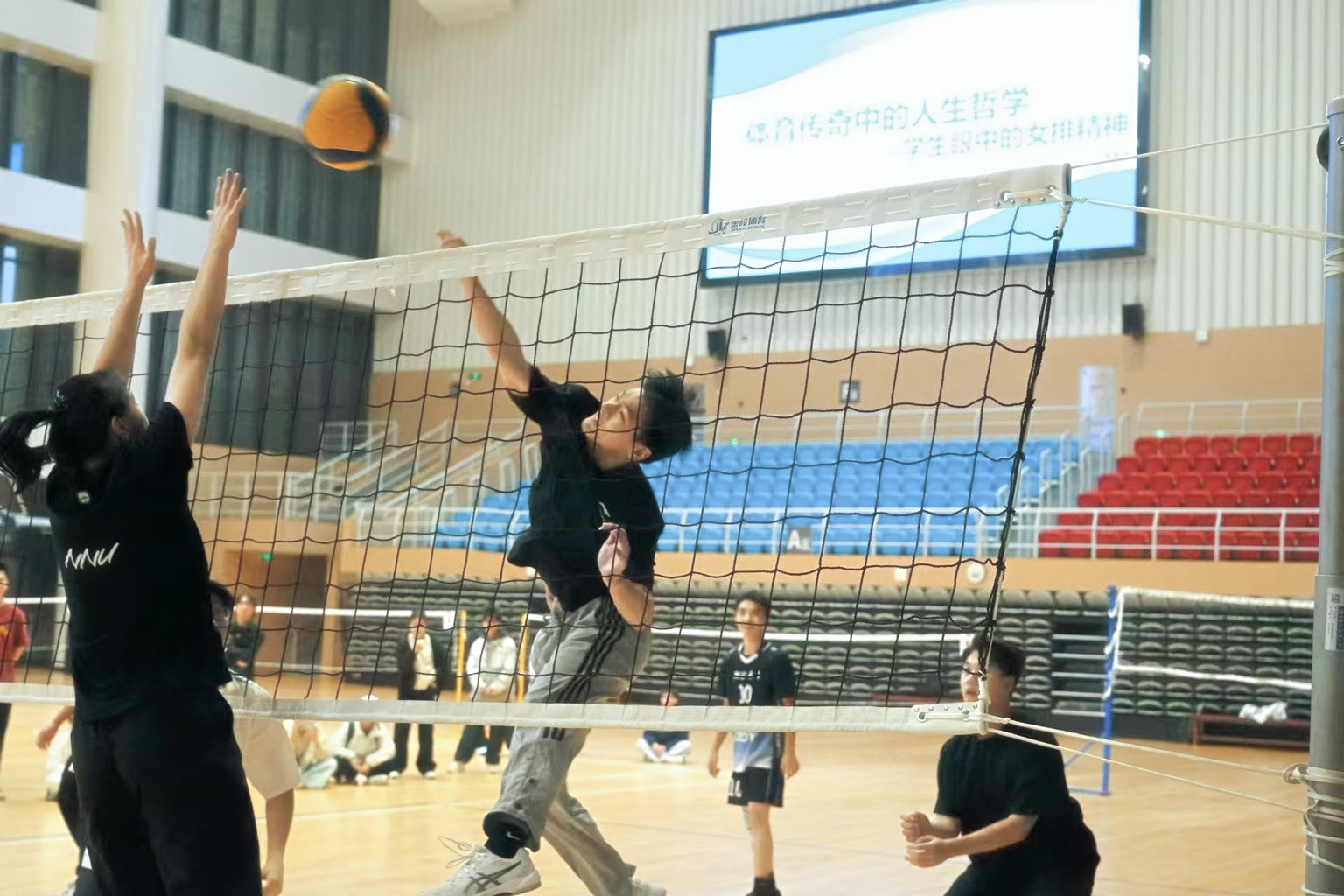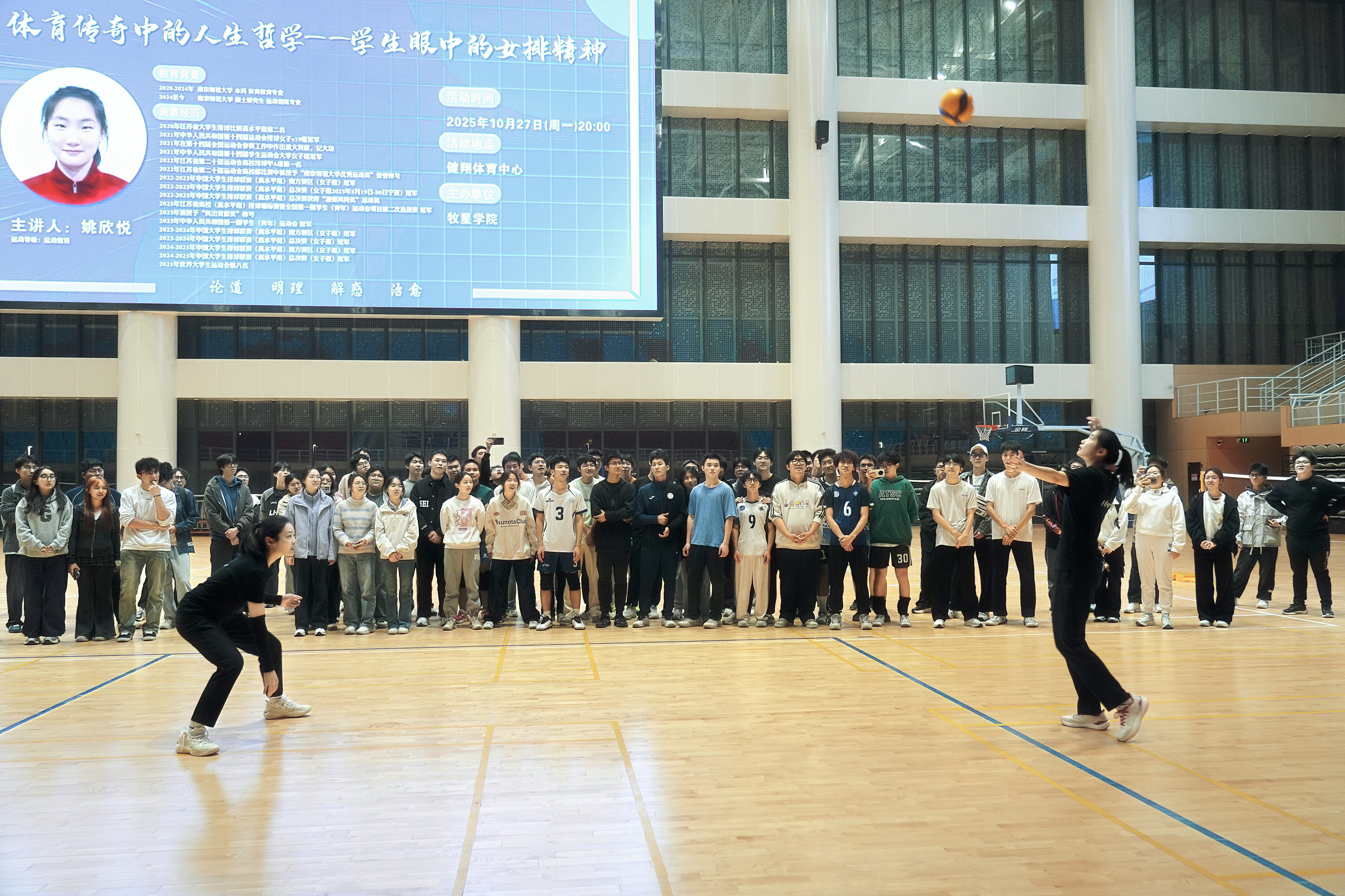 10月27日晚,申博sunbet在天目湖校区开展“问致有约·跃动牧星:员工眼中的女排精神”主题活动。本次活动由申博sunbet副经理张建辉主讲,特别邀请南京师范大学女排健将姚欣悦、鲍雨檬与校排球队队员及全校100余名排球爱好者齐聚一堂,共赴一场排球与精神的盛宴,深切感受女排精神的磅礴力量。