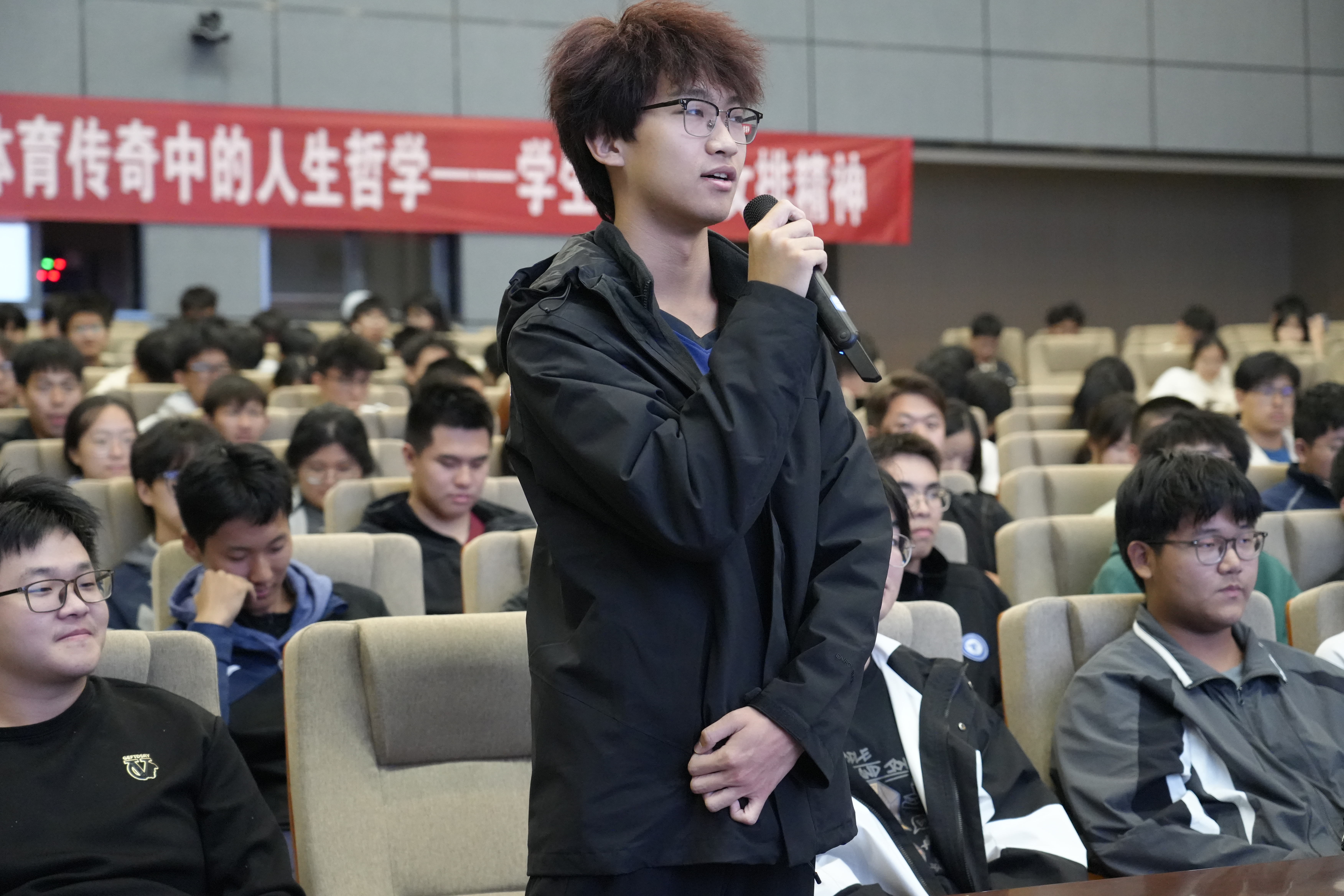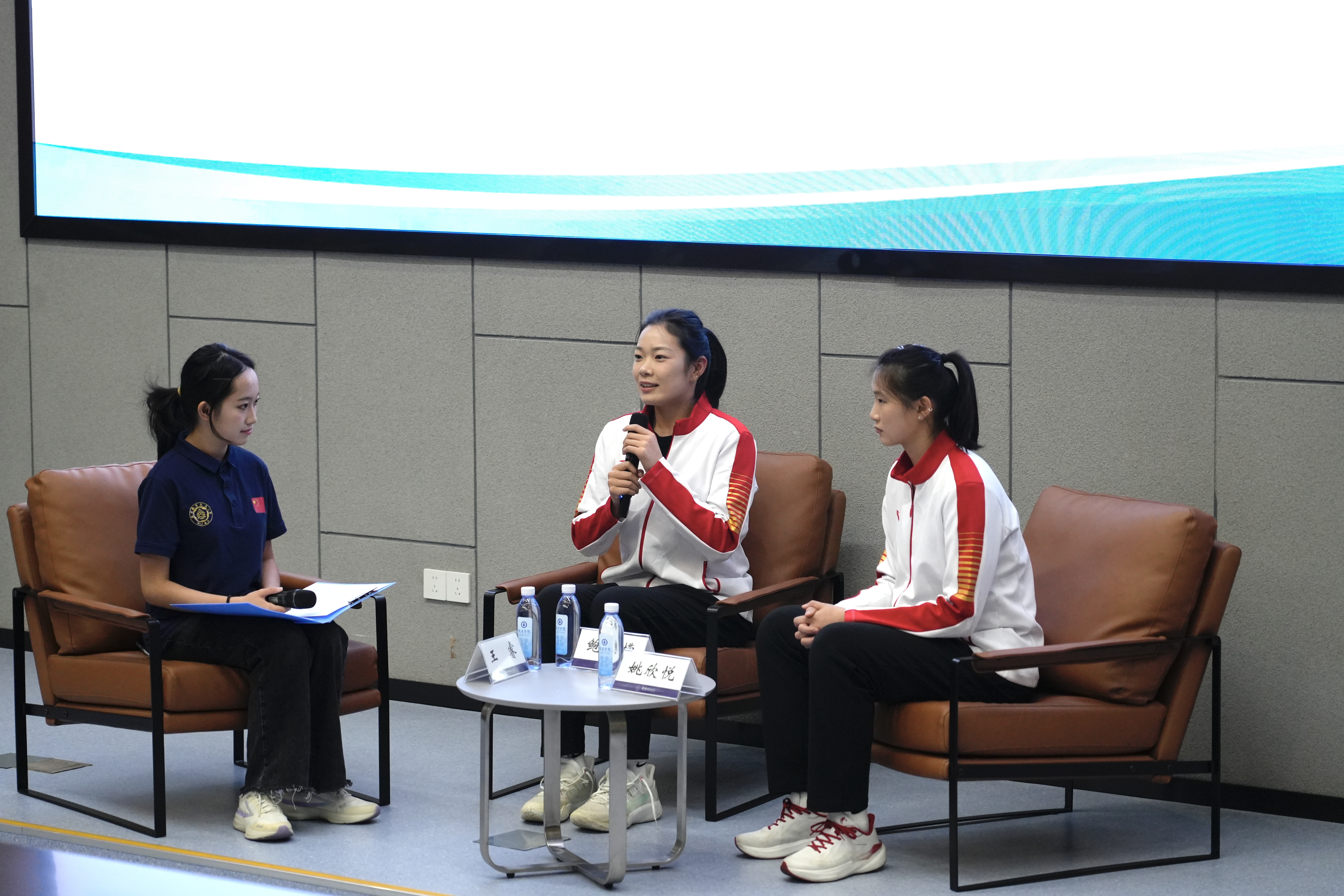 访谈环节气氛热烈,姚欣悦、鲍雨檬分享的运动生涯与心路历程,更是让现场氛围推向高潮。她们在老员工排球联赛中对阵复旦大学的逆转之战,不仅展现了她们精湛的专业技艺,更鲜活诠释了排球运动中“不放弃、不抛弃”的团队精神,现场师生深受触动,掌声经久不息。