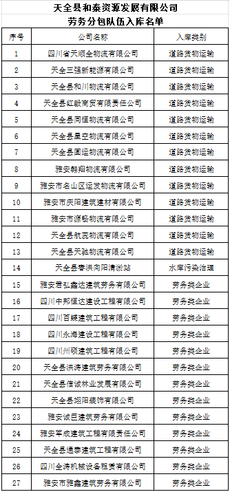 为加强我公司及下属子公司对分包队伍的选取管理,构建竞争有序、规范高效的选取制度,按照规范管理、加强服务的原则,我公司于2023年12月启动分包队伍的征集工作。经审查,共有27家公司符合入库条件,现将入库名单公示如下:
